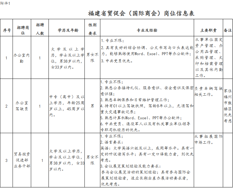附件:1.福建省贸促会(国际商会)岗位信息表