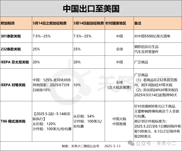 自2025年5月14日东部夏令时间凌晨12:01起,对从中华人民共和国(含香港、澳门)进口至美国关税领土的所有商品,在符合第14257号行政命令及2025年4月11日总统备忘录所列例外条款前提下,统一加征10%的额外从价税。(关务小二注:不额外加10%的例外条款商品有:所有232条款范围内的产品、14257号行政令附件II中的产品)该税率反映: