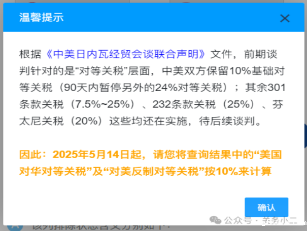关务小二提醒:商品自身关税、301条款关税(7.5%~25%)、232条款关税(25%)、芬太尼关税(20%)、反倾销反补贴税(贸易救济措施),这些均还在实施。联合声明仅谈判对等关税,未谈及停止800美元以下货物免税权利、301条款关税、232条款关税。